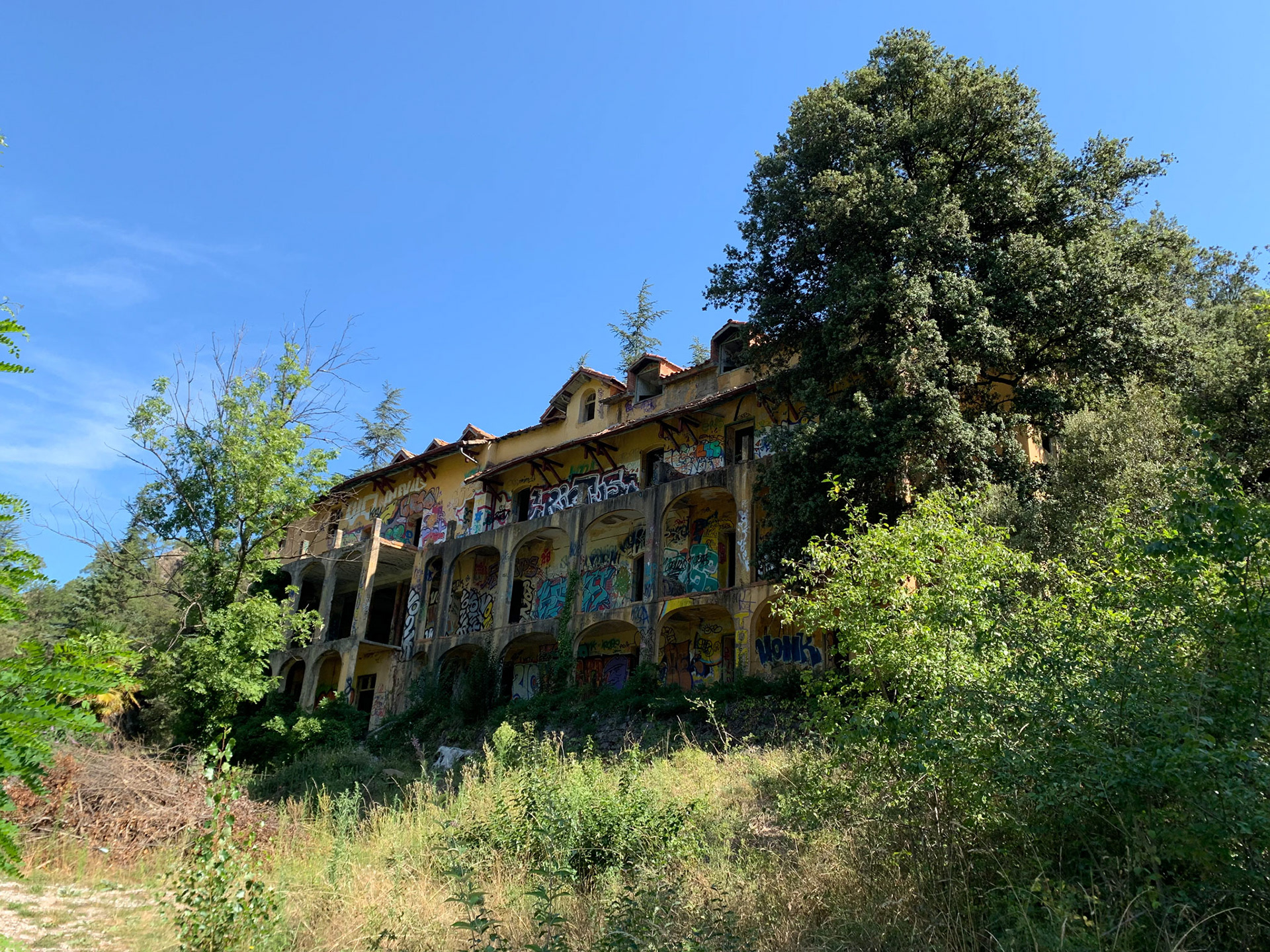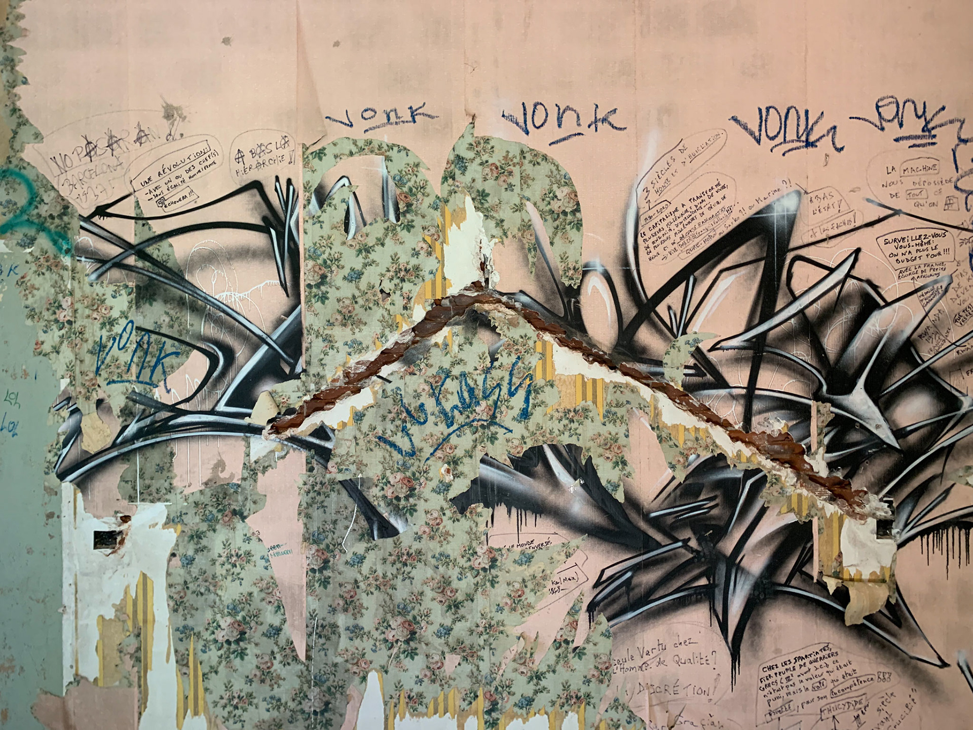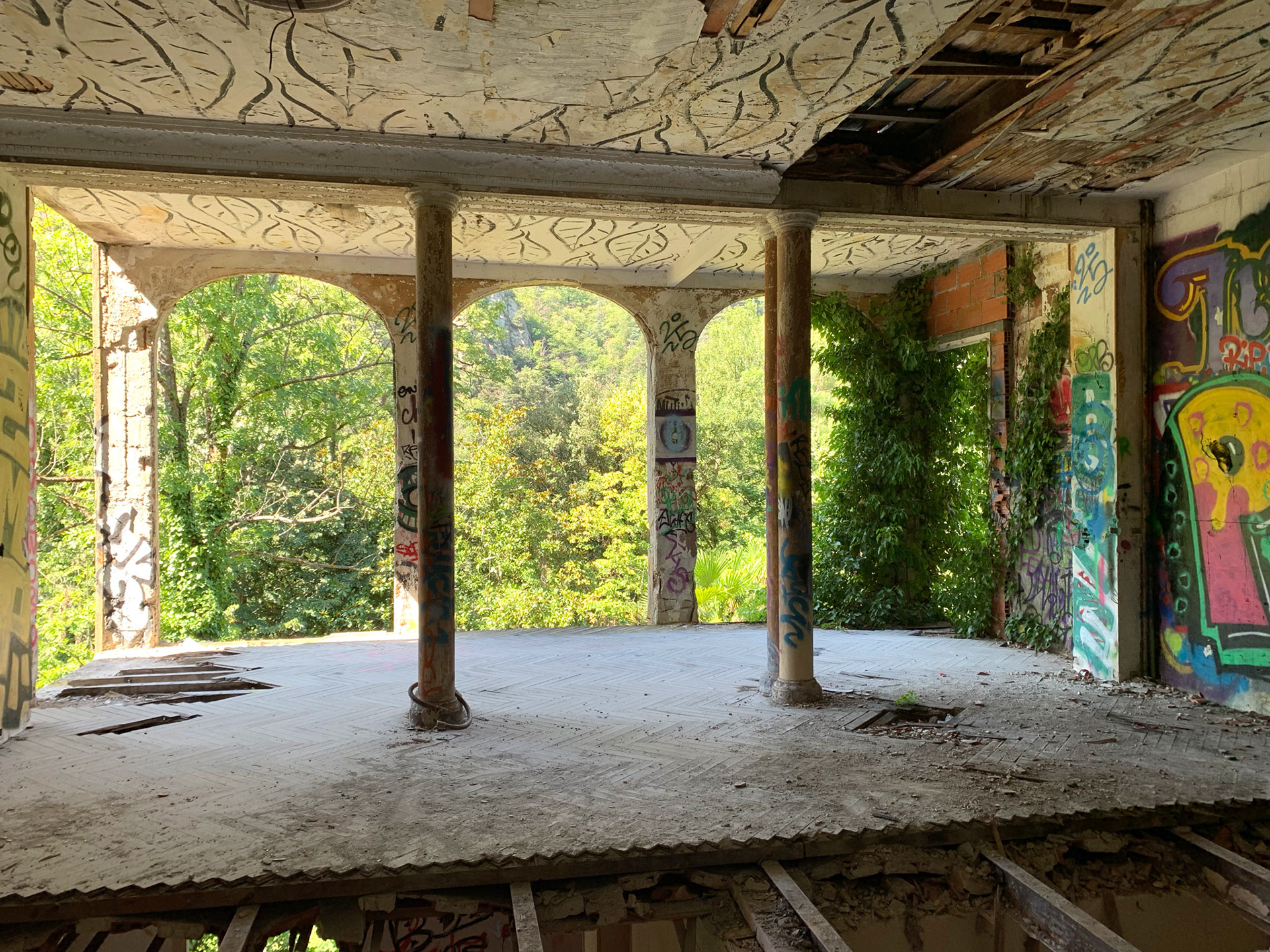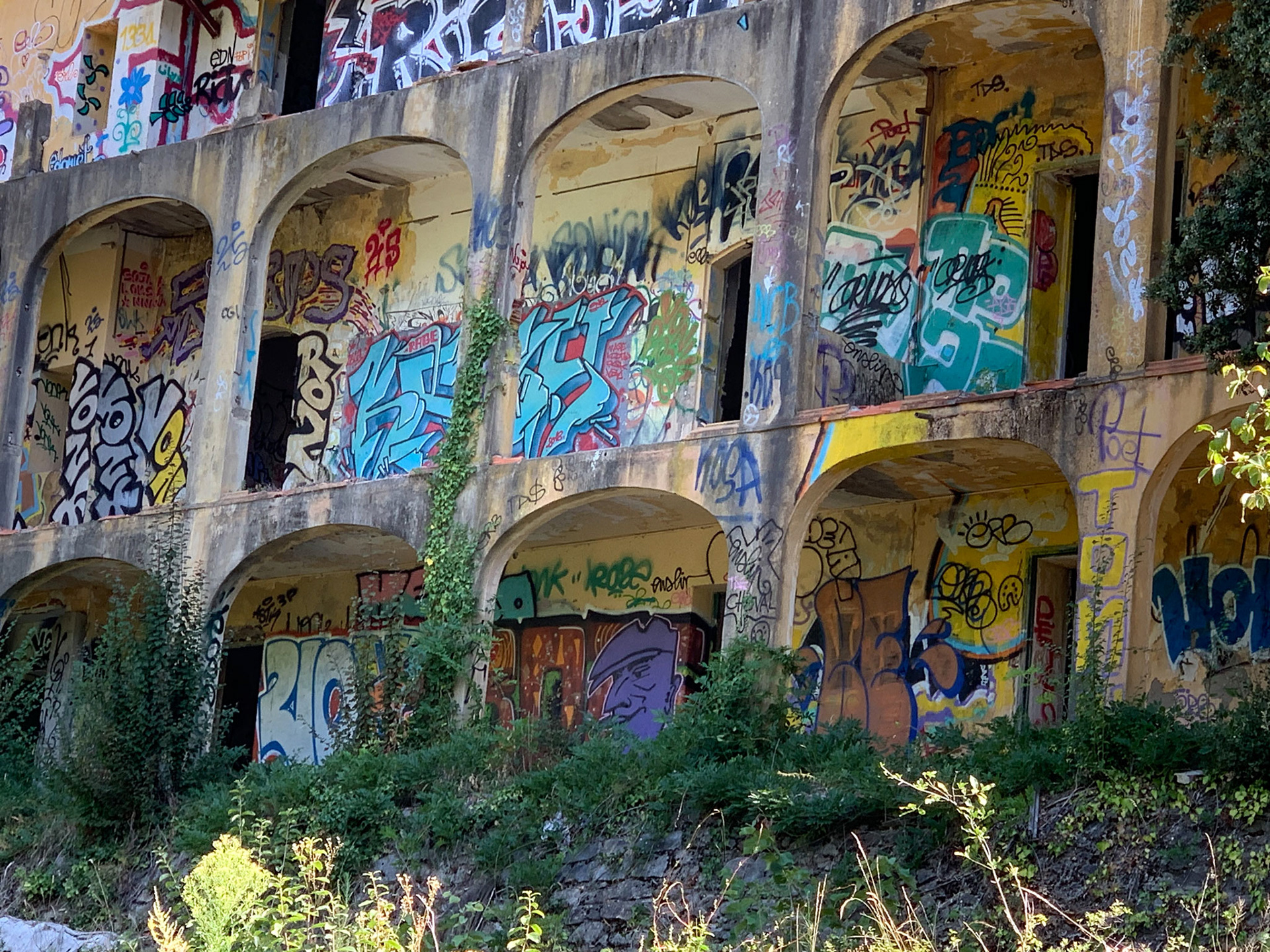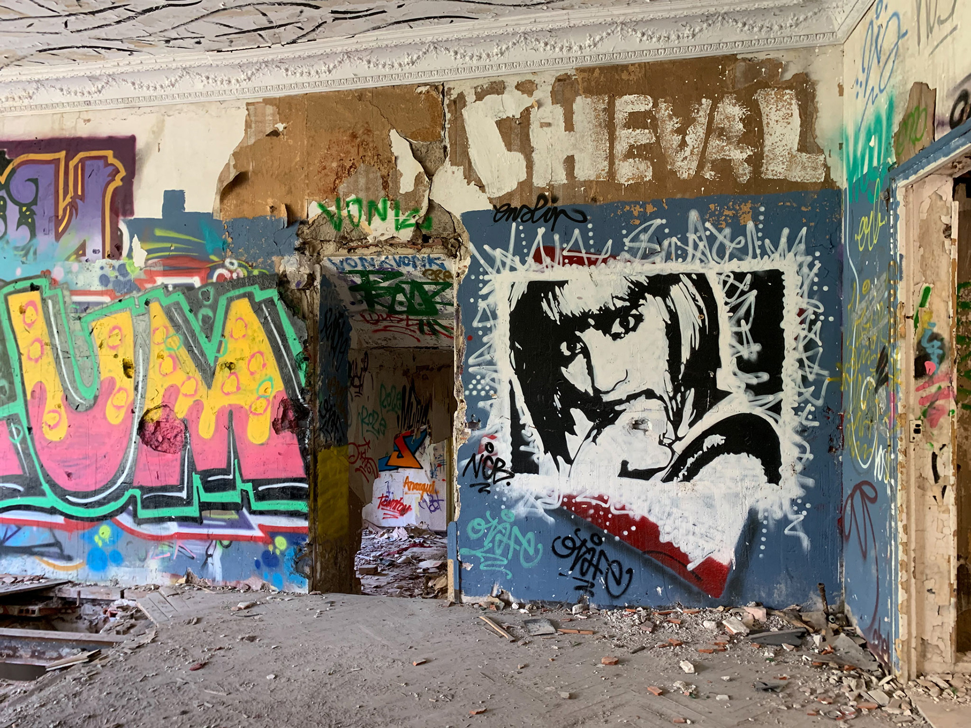 L'hôtel Alexandra est en ruine. Autour de l'hôtel la Nature garde les traces d'un ancien jardin. On sent encore les allées, quelques plantes civilisées enlacées par les broussailles. Les graffeurs ont entièrement recouvert les murs de couleurs et de mots vifs. Leurs œuvres voraces côtoient de timides scènes galantes. Leur vitalité se mêle aux gravats. La salle de bal éventrée s'ouvre sur la montagne bleue. Des jaunes primaires lui font face. Des visages aux regards crus défiant l'oubli. Le toit est tombé sur la tête. Les escaliers cul par-dessus tête renversent les perspectives. Les salles s'ouvrent les unes dans les autres en trompe l'œil. Tout craque sous mes pas. Je n'entends qu'eux. Tout me monte au regard, la confusion des temps, la tuyauterie sublimée, la délicatesse avilie, la création exhibant ses intestins. Je sens ce que je vois, fort, vite, terriblement. Je suis submergée par l'émotion paradoxale de photographier…