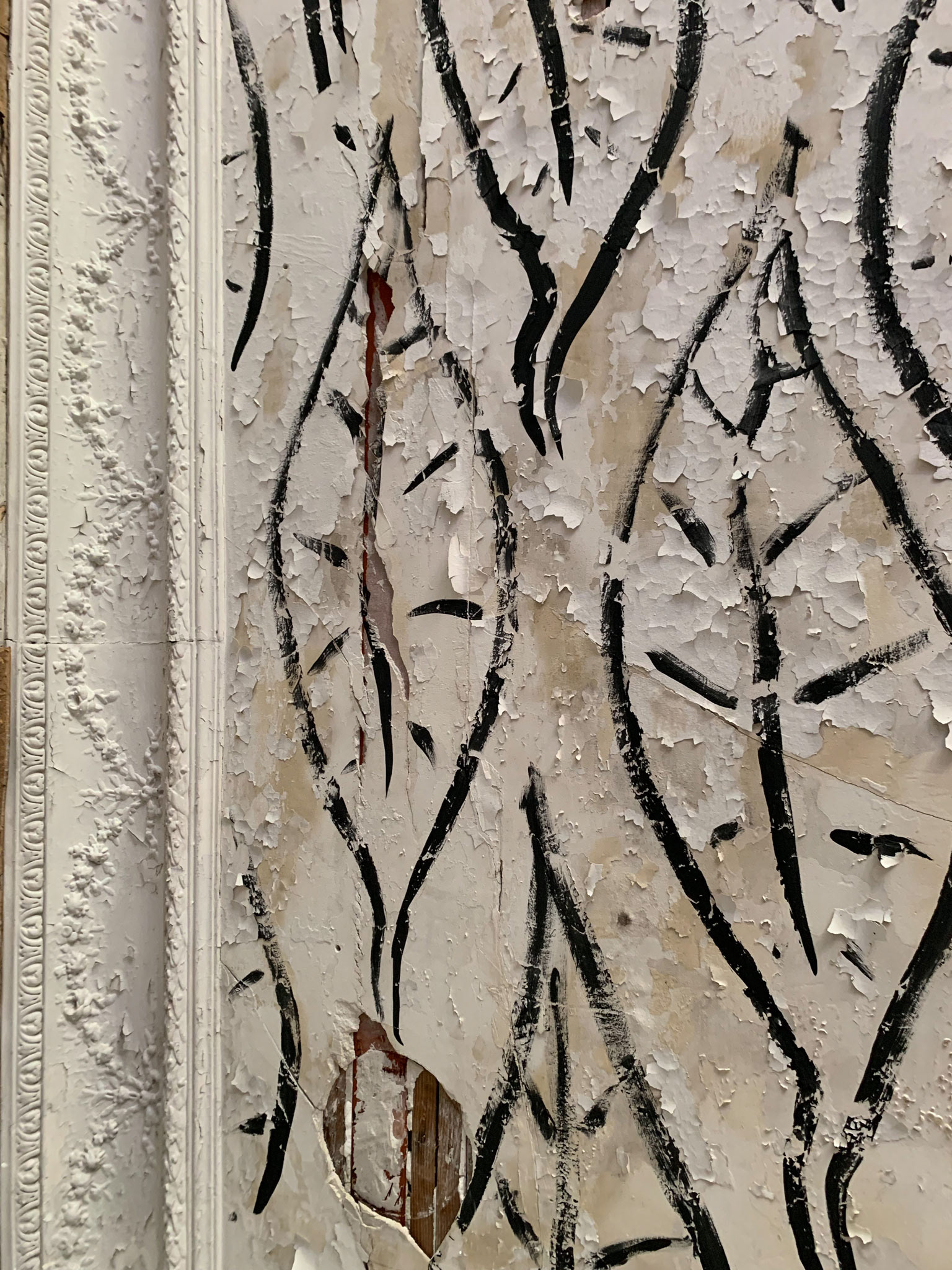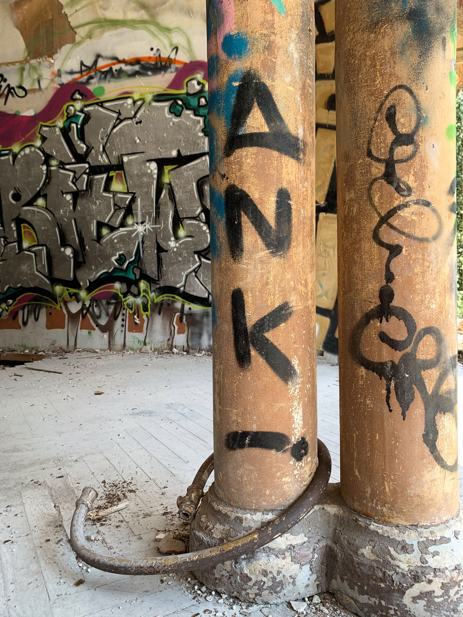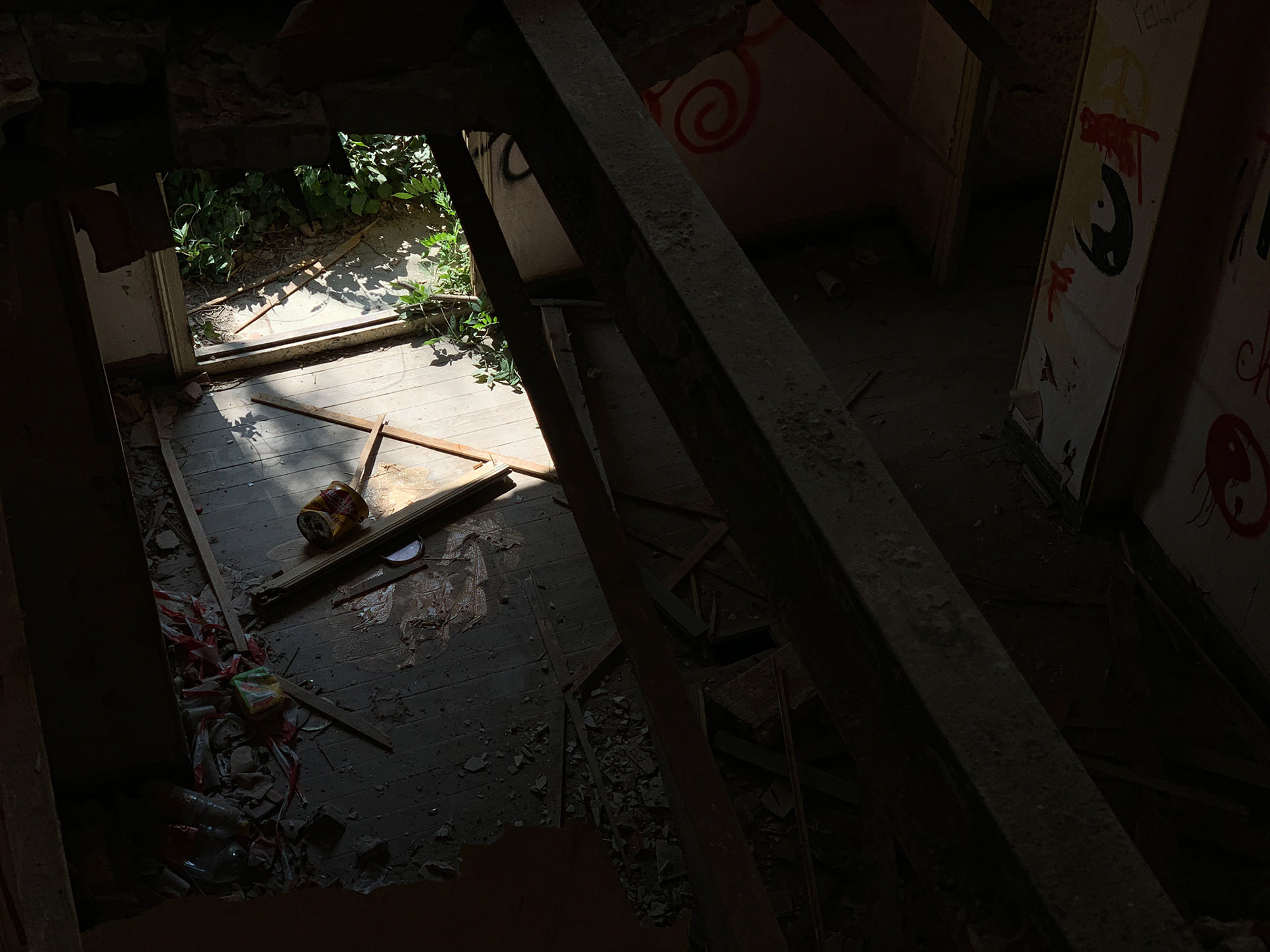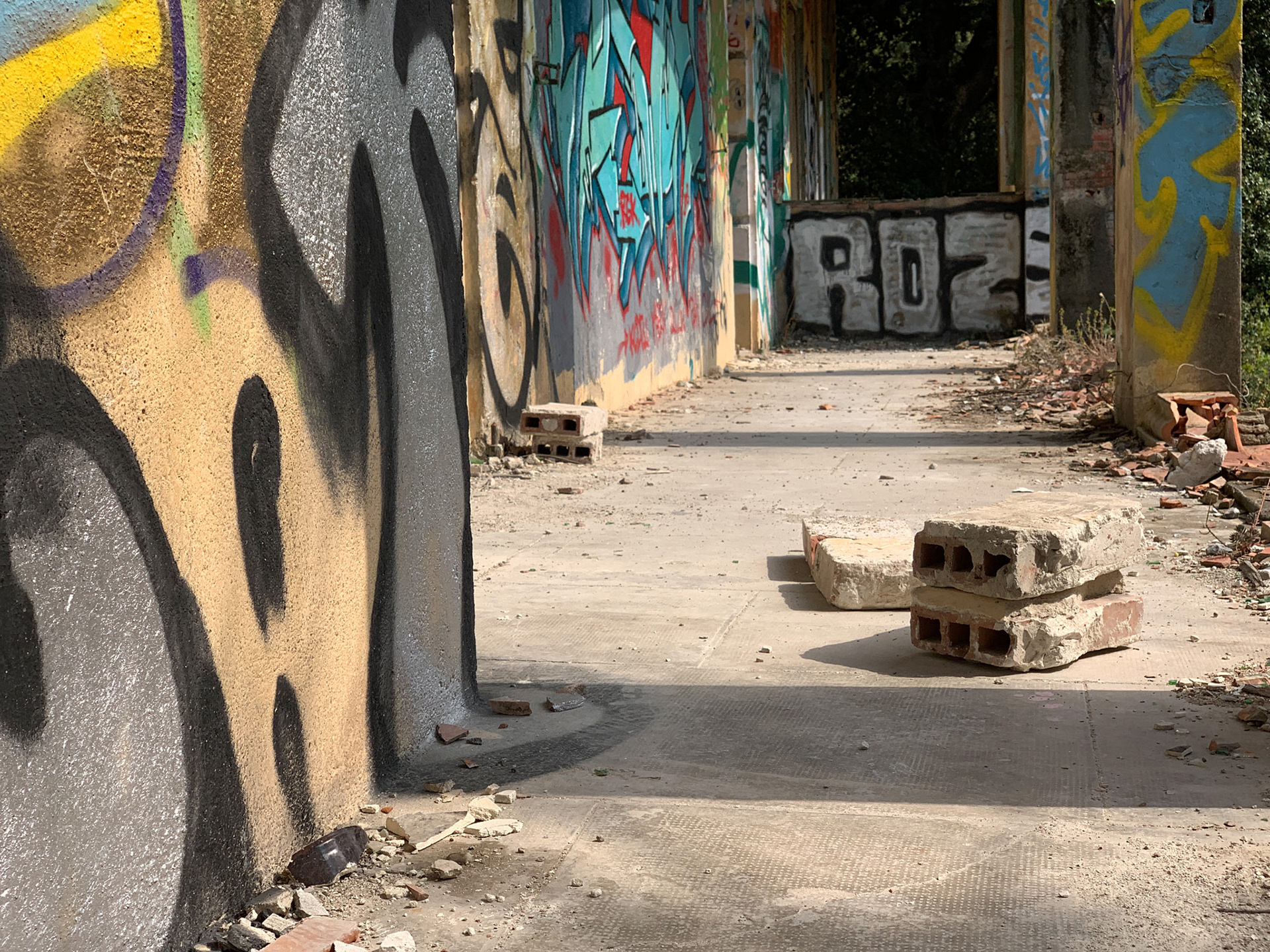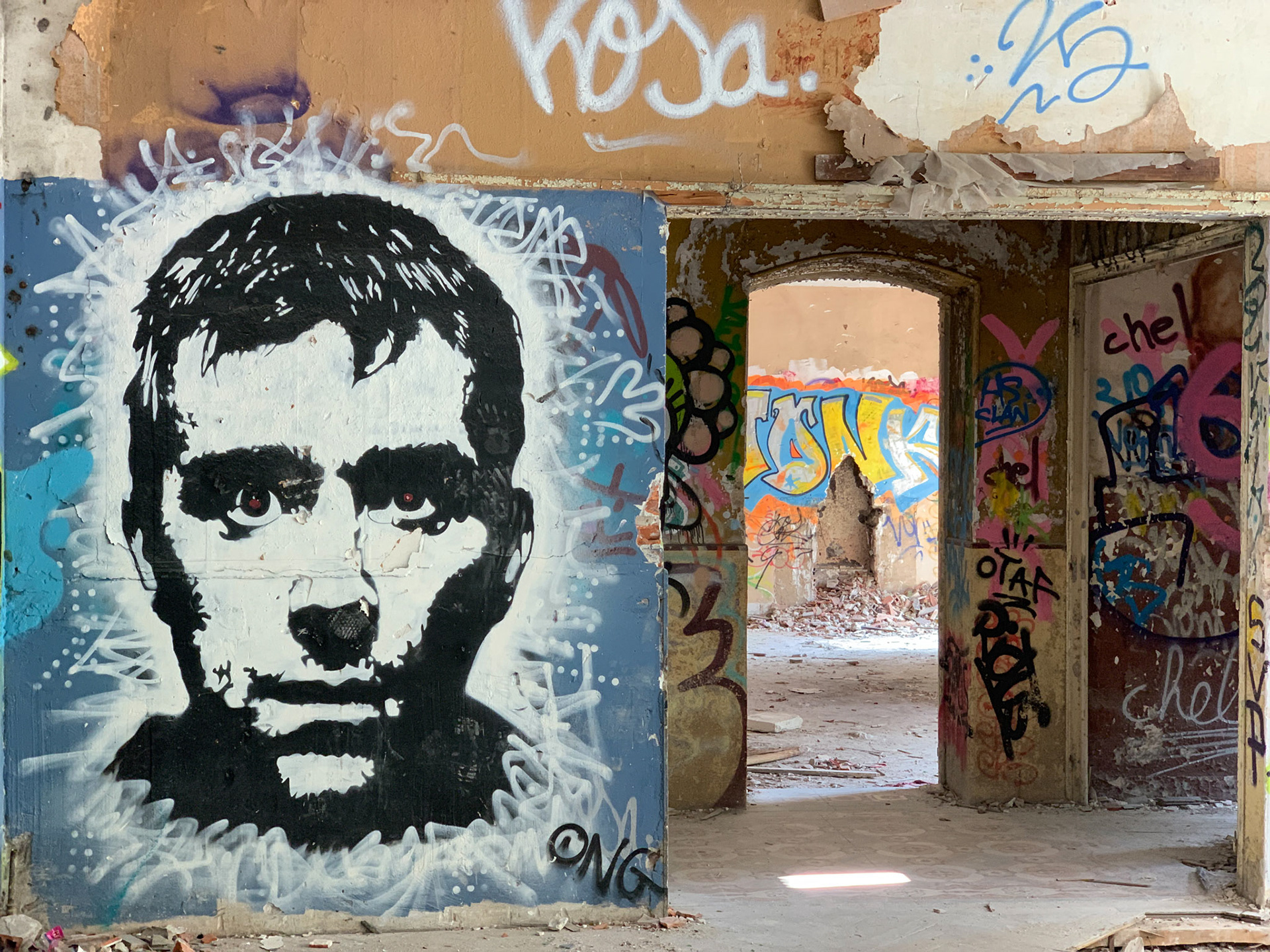 L'hôtel Alexandra est en ruine. Autour de l'hôtel la Nature garde les traces d'un ancien jardin. On sent encore les allées, quelques plantes civilisées enlacées par les broussailles. Les graffeurs ont entièrement recouvert les murs de couleurs et de mots vifs. Leurs œuvres voraces côtoient de timides scènes galantes. Leur vitalité se mêle aux gravats. La salle de bal éventrée s'ouvre sur la montagne bleue. Des jaunes primaires lui font face. Des visages aux regards crus défiant l'oubli. Le toit est tombé sur la tête. Les escaliers cul par-dessus tête renversent les perspectives. Les salles s'ouvrent les unes dans les autres en trompe l'œil. Tout craque sous mes pas. Je n'entends qu'eux. Tout me monte au regard, la confusion des temps, la tuyauterie sublimée, la délicatesse avilie, la création exhibant ses intestins. Je sens ce que je vois, fort, vite, terriblement. Je suis submergée par l'émotion paradoxale de photographier…